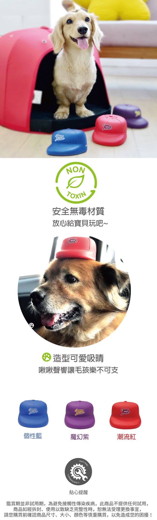 淘氣可愛的帽子造型,搭配啾啾聲響,對寶貝有著難以抵抗的吸引力!選用安全材質製成,不用擔心毛孩啃咬